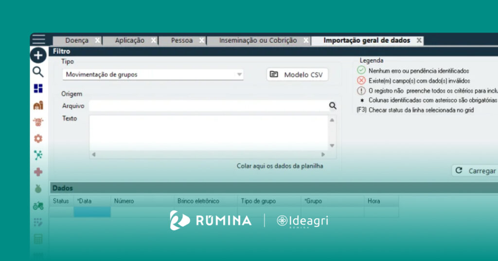Disponível na tela de importação geral de dados – Ideagri Desktop Objetivo Facilitar a movimentação de grupos para grandes volumes de animais por meio de importação de planilhas no formato .CSV, utilizando a tela de Importação Geral de Dados. Como acessar Como usar 1. Baixar o modelo CSV Clique no botão Modelo CSV para baixar […]