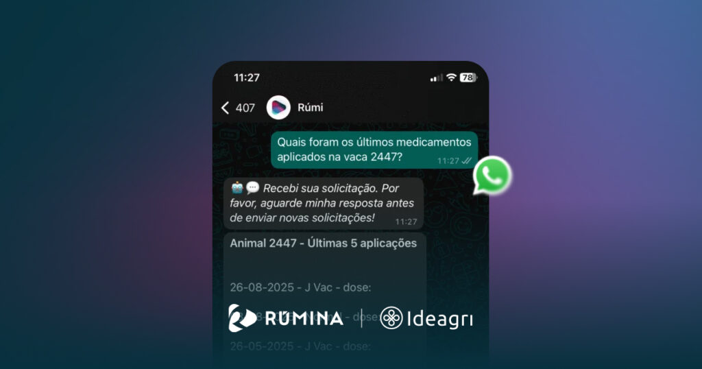 A Rúmi acaba de ganhar uma atualização que vai tornar o manejo do seu rebanho ainda mais ágil e eficiente. Agora, é possível consultar o histórico de aplicações de medicamentos de cada animal diretamente pelo WhatsApp, de forma simples e prática. Você poderá visualizar todo o histórico dentro do período que desejar ou consultar rapidamente […]