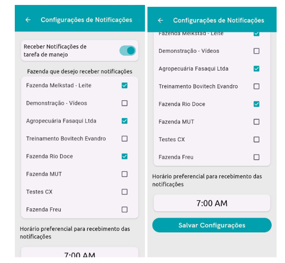 c) Definição do horário preferencial: no momento, os alertas chegam todos os dias às 07:00, como no WhatsApp. Em breve, você poderá escolher o horário que preferir para receber as notificações. Importante: essas preferências (fazendas e horário) são salvas por dispositivo.