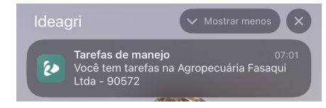 a) Recebimento da push notification: diariamente, as 07:00, você receberá uma notificação push no seu celular. Esta notificação indicará a existência de “tarefas de manejo” para a sua fazenda, incluindo o nome da fazenda (“tarefas de manejo, fazenda tal”) para que você identifique rapidamente a qual propriedade se refere.