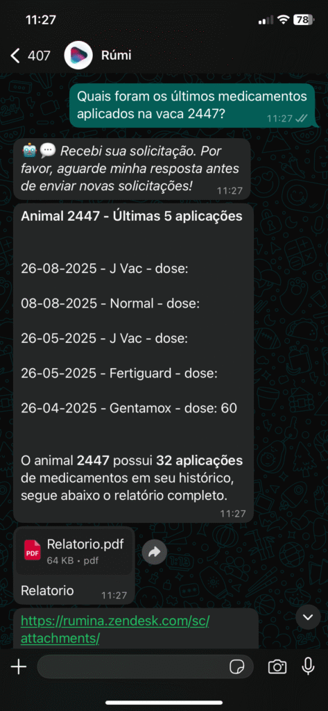 A Rúmi acaba de ganhar uma atualização que vai tornar o manejo do seu rebanho ainda mais ágil e eficiente. Agora, é possível consultar o histórico de aplicações de medicamentos de cada animal diretamente pelo WhatsApp, de forma simples e prática.